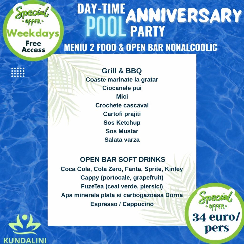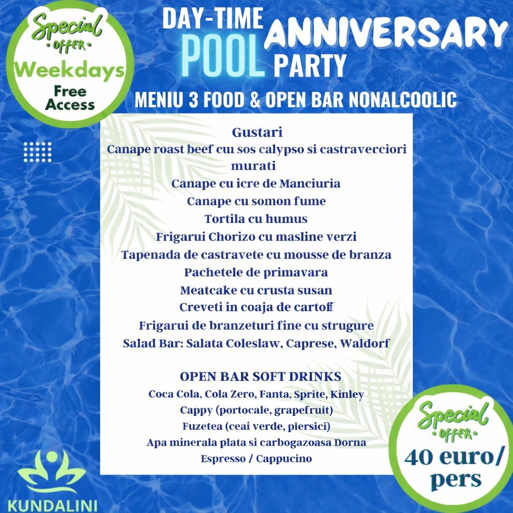 Pe lângă amplasarea deosebită in parc, într-un cadru natural, facand parte din Centrul de Evenimente Velveto, piscina Kundalini te va intampina cu un design unic, bucătăria fină, pizza proaspata scoasa de pe vatra si o lista impresionantă de cocktail-uri la lounge-ul amenajat cu stil, o muzică de calitate și vibe-uri în trend. Această este cu siguranță rețeta unui eveniment reușit!